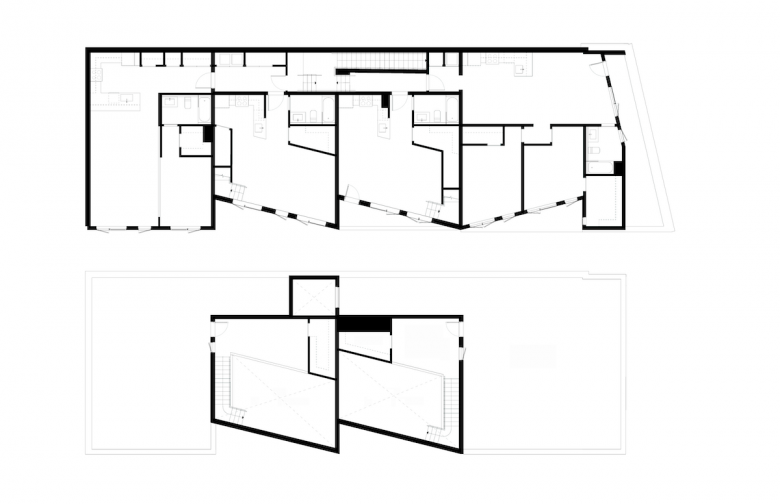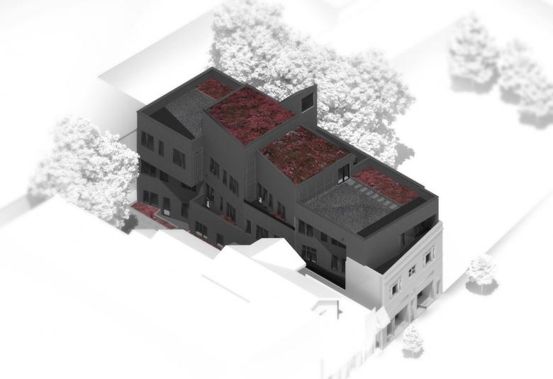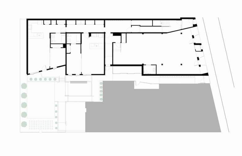The design begins with the premise of contrast between old and new, and a desire to break down massing and develop outdoor spaces, executed within a disciplined geometric framework.