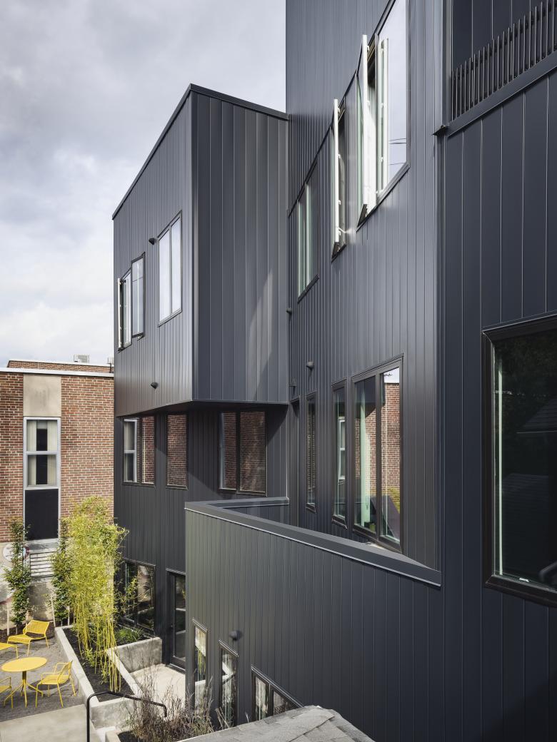 Allen Apartments recreates the facade of a severely distressed historic building with an all-new structure behind containing ten residential units and a retail space, while also incorporating and rehabilitating a second older structure on the same site. The project features a distinctive mixture of historic and contemporary construction, with a variety of outdoor spaces of differing scales, giving each unit a unique experience.