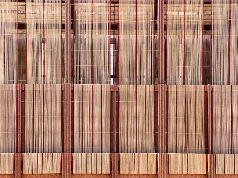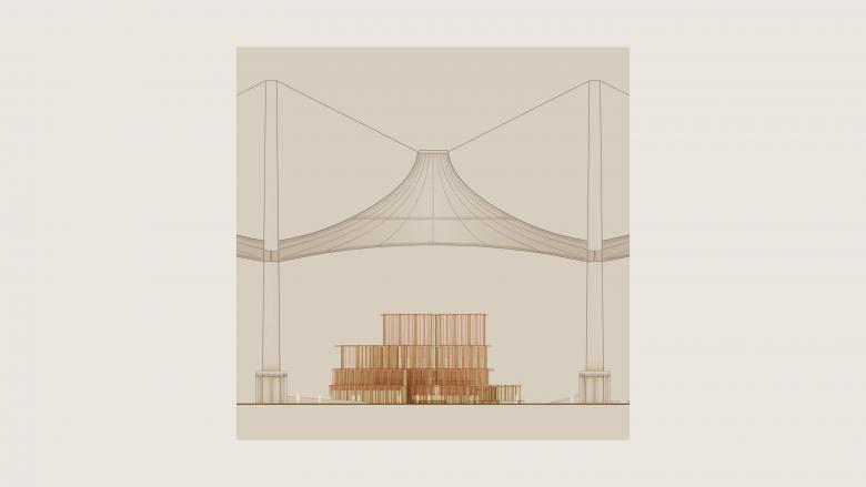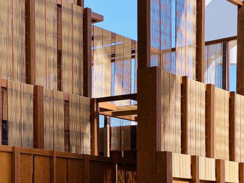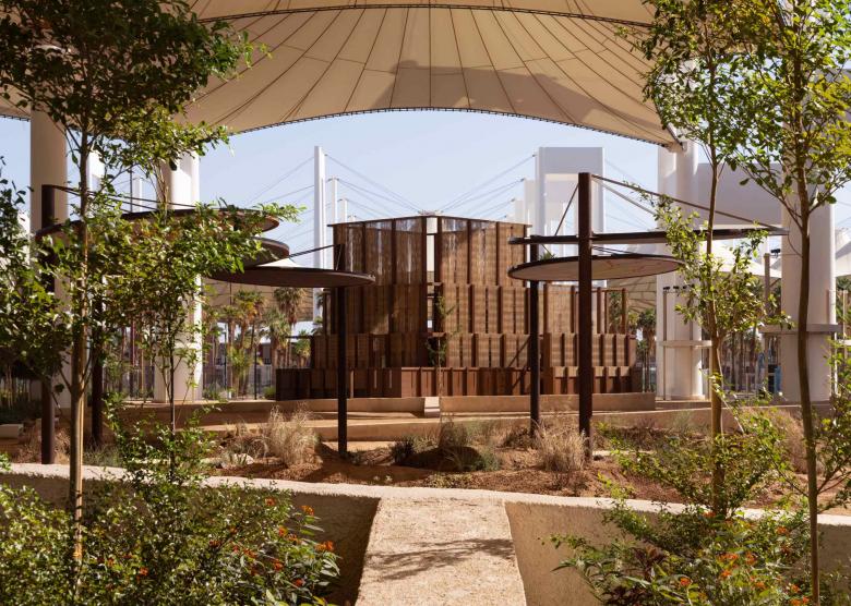 The structure celebrates the Saudi date palm tree by utilizing its waste as a primary building material; using palm fronds to rethink columns and beam, and palm fiber to compose a hand-woven textile that envelops the pavilion. The result is a truly carbon negative structure.