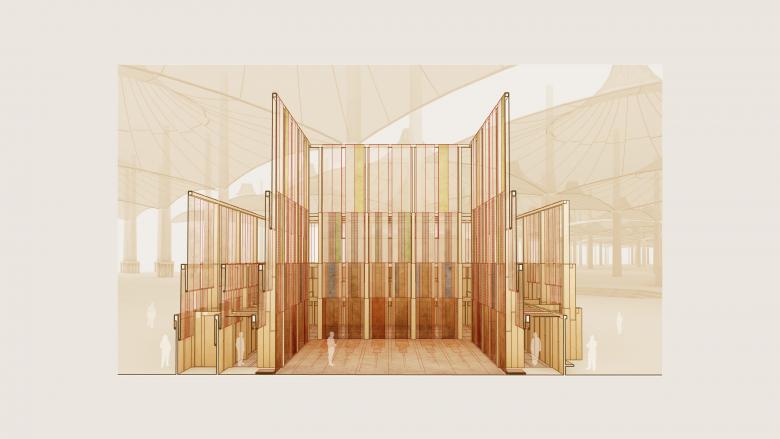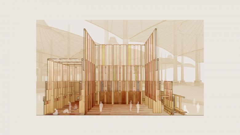 The project celebrates the architectural legacy of Muslim societies. AlMusalla reimagines future spaces of worship as modular, empowering, and transient. It not only pushes the paradigms on sustainable design and cutting-edge technology, but also emphasizes opportunities for dialogue and community building — reclaiming the true essence of a musalla space. The winning proposal features a structure inspired by regional weaving traditions and relies on waste materials derived from local date palm trees. The design consists of an open central courtyard and prayer spaces that form a structure that resembles a loom, addressing togetherness and proximity, which are core dimensions of prayer in Islam. This adaptable structure will be accessible to all visitors throughout the Biennale’s run.