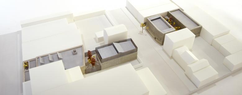 Model showing the four buildings at Amant, left to right: gallery/cafe, gallery/office, artist studios, and gallery/performance space. (Photo: SO – IL)
