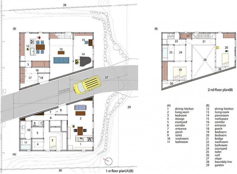 The peaks of the curved walls that extend up from either side of the sloped road are just barely separated from one another, meaning that buildings A and B are not considered a multi-generational household under the law. However, while each structure is a complete unit, we attempted to create two homes whose relationship is somewhere between neighboring and facing one another, but also share some elements of daily life and space.