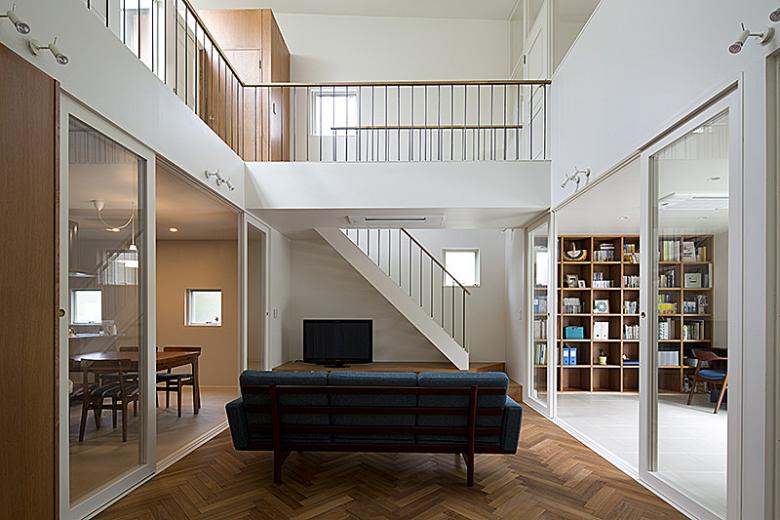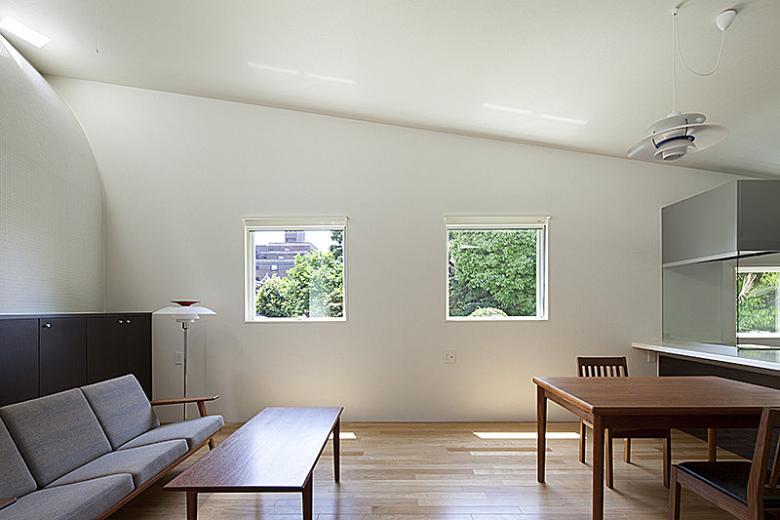 Because there is extremely heavy traffic on the former national highway, we did not include any windows on the north side of either building. The windows on the east and west sides face neighboring houses, so we also kept these small and as few in number as possible. Those on the south side, facing the garden, are large. We included courtyards and skylights in both buildings, which together with the sloping ceiling and curved walls create diversity in the interior spaces.