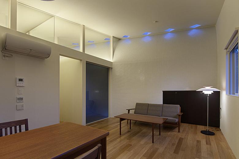 The courtyards are the largest inlets for sunlight, and in order to draw the light along the sloping ceilings and into the interior, we included glass transom windows and wall partitions. Light from the skylights also reflects off the porcelain tiles lining the curved walls, transforming the feeling of the space depending on the weather or time of day. On sunny days the light has a sharp edge to it, while on cloudy days it’s softer, and in the mornings and evenings the rooms are suffused with a faint periwinkle light.