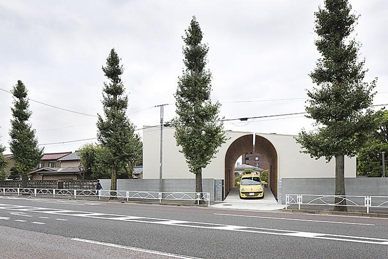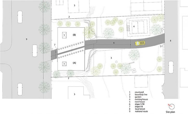 Taking into consideration transportation in the community and convenience, we designed the sloping path so that a car can pull up to the entryway of either building A or B. The entry to Building A is barrier free; to prevent crime, the floor levels are raised so that windows are at least two meters above the exterior ground level.