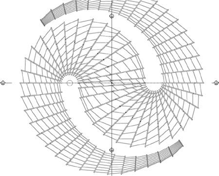 The geometry of the pavilion is symmetrical, but its shape varies as it goes along, from a radius of 2.2 meters to a height of 3.3. meters. All of the elements of the pavilion are vertical, so that the shadow it casts is a reflection of the original plan.