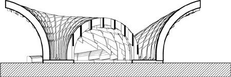 The structure, completely dismountable, is composed of 653 pieces of wood, columns, and transversal beams. The eight arches in the middle of the pavilion, gradually cantilevered, create an intimate space. Some of the columns are divided into two segments, sustained by a steel base on the ground and joined with metallic connections. The transversal beams were cut with a CNC machine; their angles were fashioned by hand based on their relation to the columns.