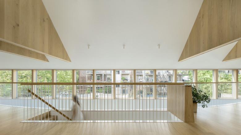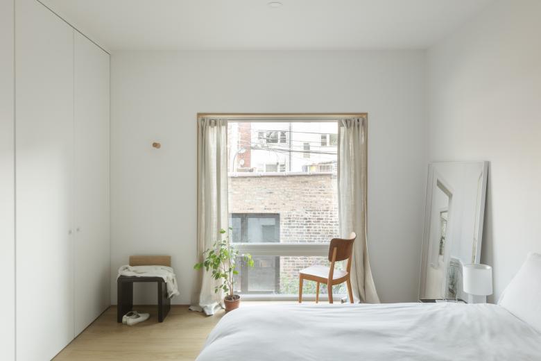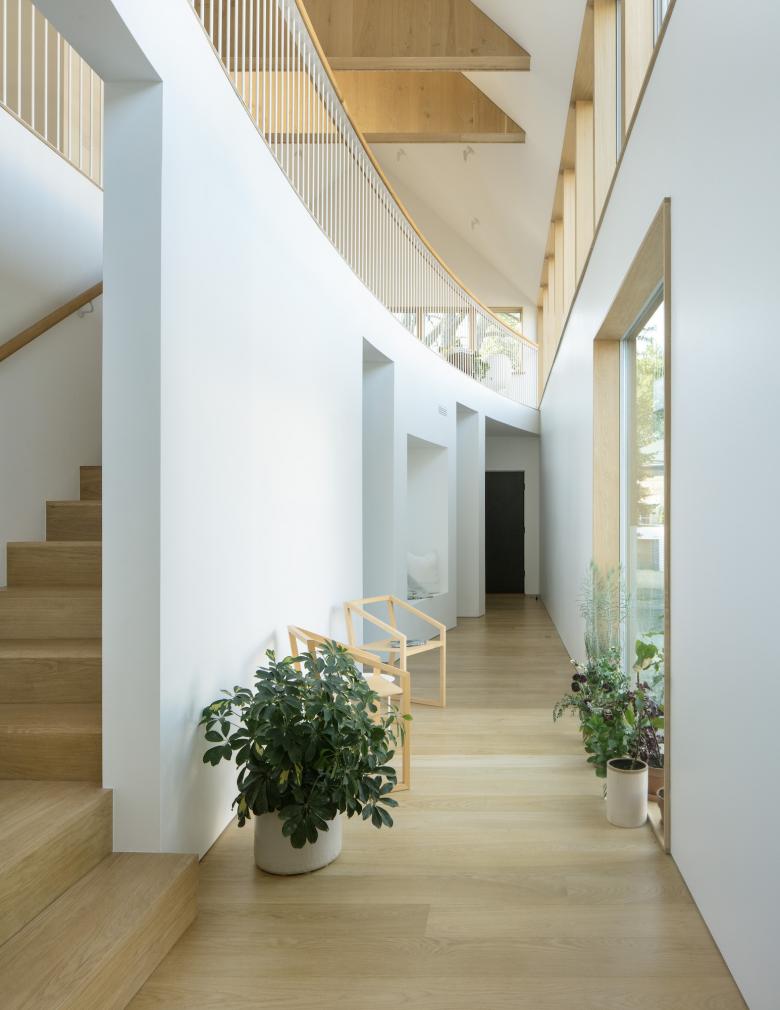 A stair tucked behind the courtyard’s curving wall leads to the second floor. The open plan is organized around four trusses that support the house’s Chicago balloon frame. These trusses distinguish five areas set around the curve of the balustrade: the kitchen, the island, the dining room, the powder room, and the living room. Throughout, a restrained colors and materials palette—white walls and white oak wood floors, trusses, and furnishing—draws attention to the qualities of the spaces themselves. All of the shared and public spaces on the second floor are oriented towards a ribbon window that spans the length of the interior courtyard. The 56-foot-long window floods the home with natural light and opens panoramic views that capture the fullness of the surrounding neighborhood: century-old trees, the back balconies and fire-escapes of neighboring buildings, and street lamps with their meandering cabling.