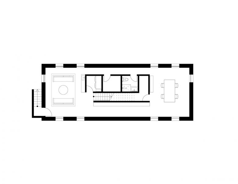 The exterior of the home engages the neighborhood’s traditional vernacular style while reflecting the organization of the interior spaces. The design shifts the facade hierarchy from the street to the alleyway, the most urban of the contexts. The street-facing facade has a row of half-height ribbon windows along the second floor and a single door on the first level, maintaining privacy for the front bedroom. On the alleyway side, floor-to-ceiling windows on the second floor and a large picture window facing out to the alleyway from the interior courtyard open the interiors to the urban surroundings.