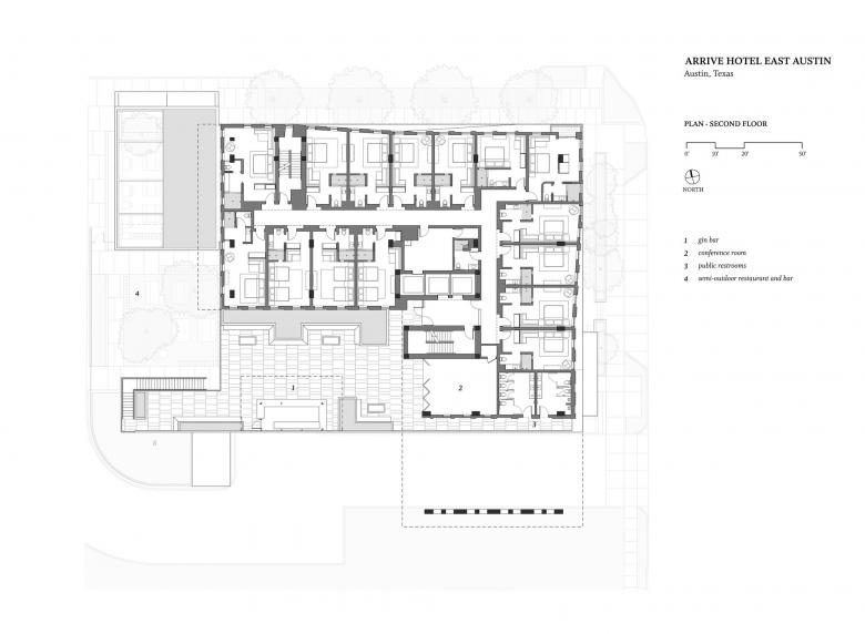 For materials, we looked to existing warehouse structures nearby. The masonry-infilled concrete structure evokes the neighborhood history without resorting to mimesis. semi-outdoor restaurant reuses a pre-existing masonry structure (now physically attached to the principal hotel by way of the kitchens) further tying the complex back to its original East Austin roots.