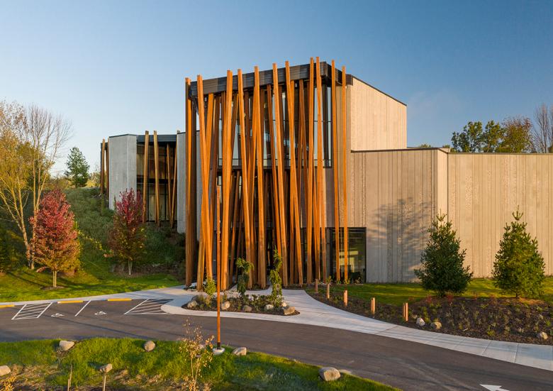 When Ruth Kohler was asked “what should this building be made of?,” she responded with sticks, stones, and earth, similar to materials of the site. With that in mind, the primary elements that are most important to the exterior structure are the concrete panels comprised of stones and rock found in Wisconsin glaciated riverbeds and the regionally sourced timber shades that create the forested entry of the building.