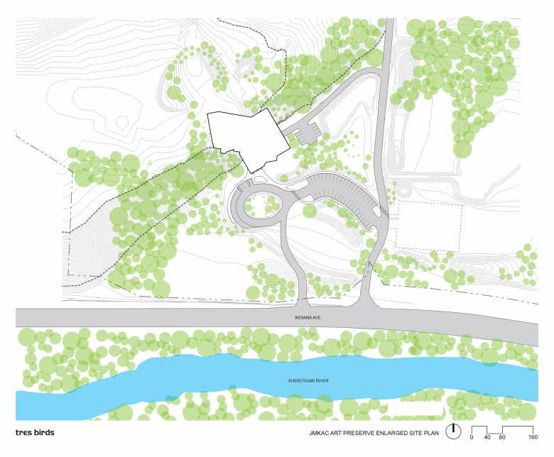 The main design inspiration is A Walk in the Woods. Since the potency of much of the Art Preserve’s collection is found in its relationship to nature, the walk-in-the-woods design approach allows moments of interaction between the artwork and the natural environment. The John Michael Kohler Arts Center felt strongly that the art should be visible and that the site, collection, and building should be greater than the sum of its parts. They wanted the building to be connected to nature and made from “sticks, stones, and earth.” The timber shades are the sticks; the hill is the earth; the stones are the regional river rock aggregate of which the building is mainly composed. Engaging the landscape in its design, the building will feel as if it has grown organically out of the hill and meadow site. Visitors will view the artworks with nature as a backdrop.