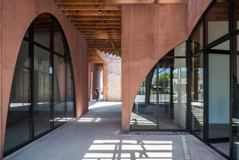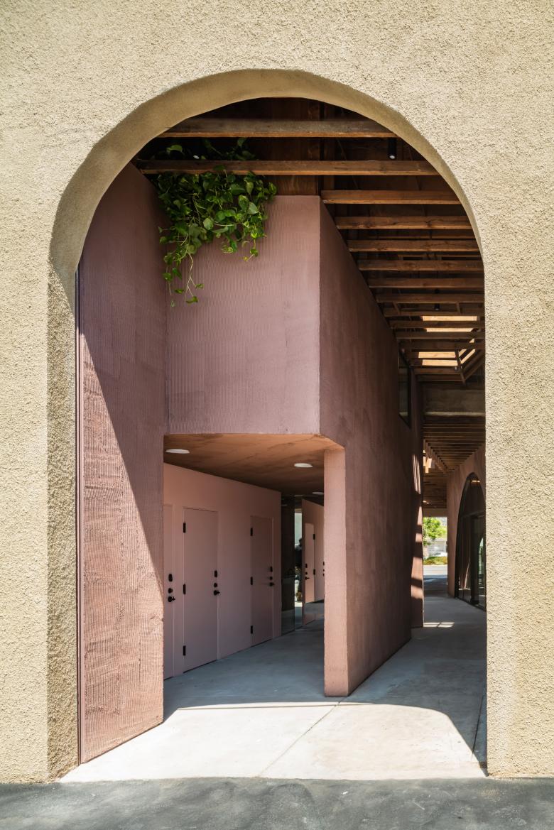 Lined with a roughly raked plaster, the passageway’s elevations are articulated with large arched apertures, storefronts to new restaurant and retail tenants and irreverent echoes of the existing facade. The rear entrance is announced with a tall arched opening, directly through which an open-air washroom greets visitors entering from the parking lot. Offering a bank of gender-neutral stalls, these amenities present a more hospitable approach to everyday business.
