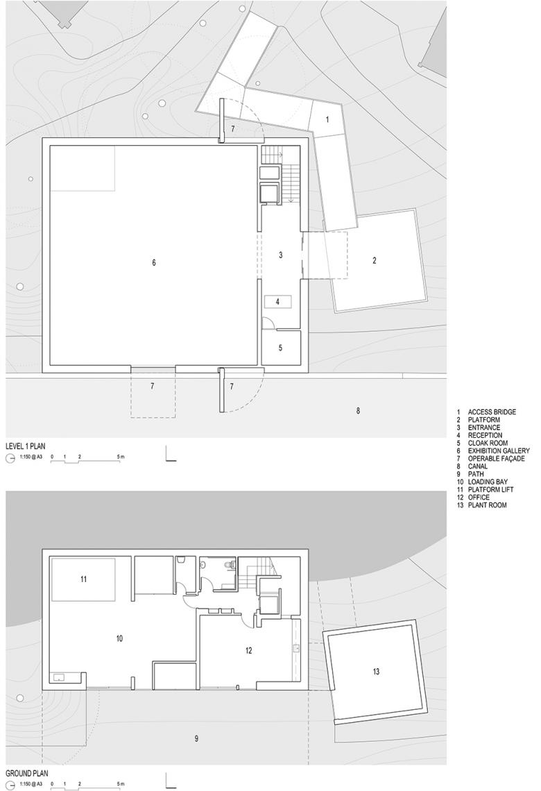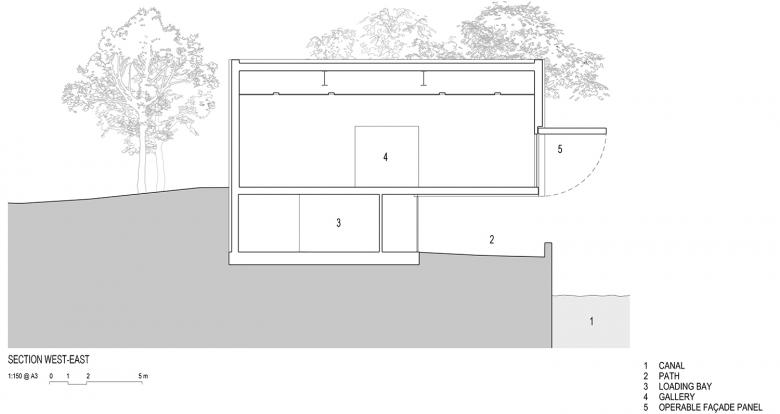 The black box exterior is a rectilinear block modified to incorporate a cantilever over the canal-side pathway. Its granite exterior can nearly disappear into the treescape or assert its power, depending on one’s angle of approach. The black box also features large operable panels on three faces, which may be opened to reveal the interior, or to provide natural light or a sense of vista.