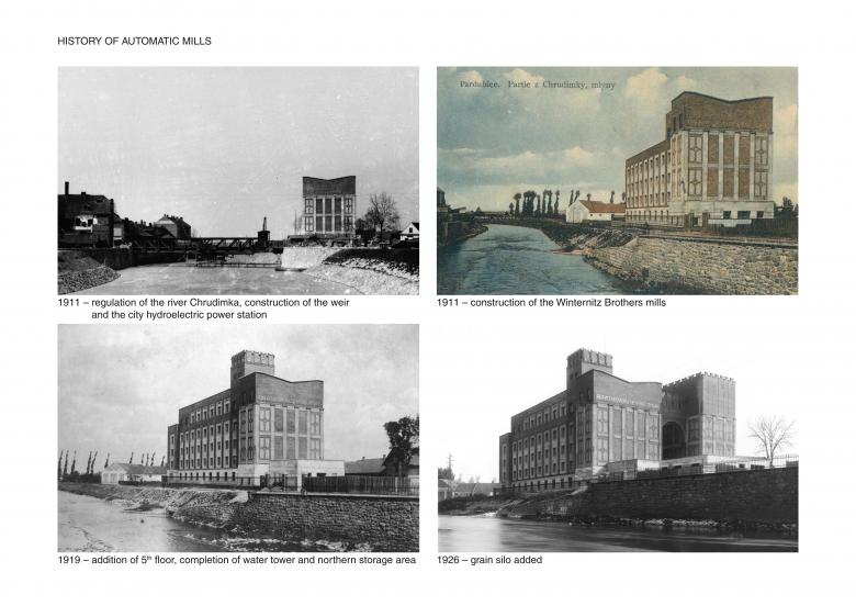 The Automatic Mills, a national cultural monument, is one of the first buildings designed by the architect Josef Gočár. Standing on the banks of the Chrudimka River in the centre of Pardubice, the monumental mill building was created in 1909 for the Winternitz brothers. In 1924, the complex was extended to include a grain silo, the conversion of which we designed. The Automatic Mills operated continuously for more than 100 years until 2013. Since 2016, the mill brownfield has been undergoing transformation into a cultural and social urban district, thanks to the initiative of the Automatic Mills Foundation.