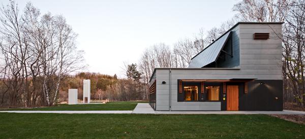 To help achieve LEED Platinum rating, recycled timber, recycled paper-resin siding, trim and countertops, partially recycled zinc siding and recycled granite pavers were used. The new wood materials have no applied finishes or VOC coatings. Composting toilets combined with the storm water retainage at the green roof makes this building close to a zero-water waste producer.
