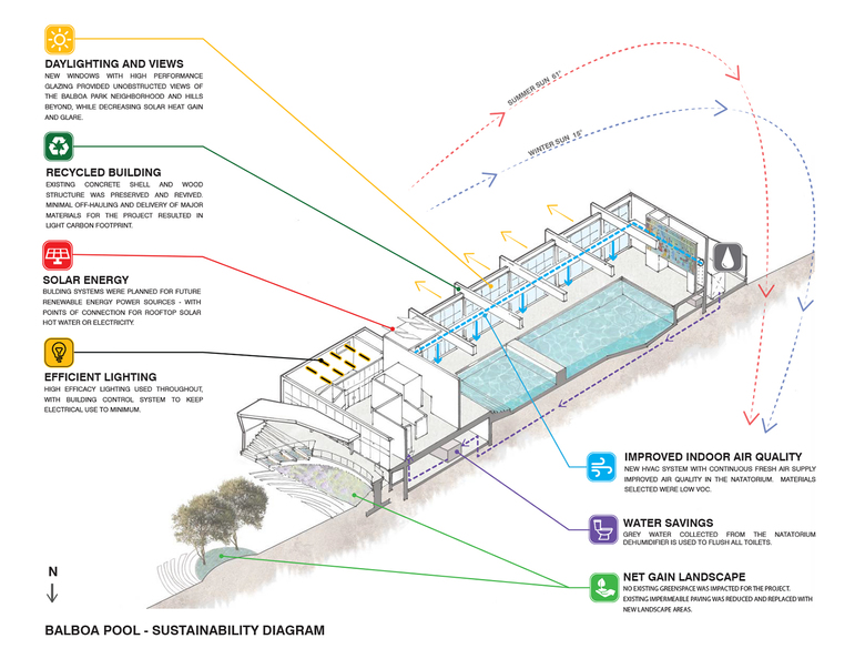 - RECYCLED BUILDING: The pool’s historic renovation was inherently sustainable. The building was retained and reused, thus saving energy in the manufacturing, transportation, and installation of new materials and in the disposal of demolished materials. As a renovation of a historic building, this project sought to retain as much of the existing building original fabric and materials as possible, including patching and repairing and of existing concrete walls and structural elements and preservation of the existing wood roof structure. Existing concrete shell and wood structure was preserved and revived. Minimal off-hauling and delivery of major materials for the project resulted in light carbon footprint.