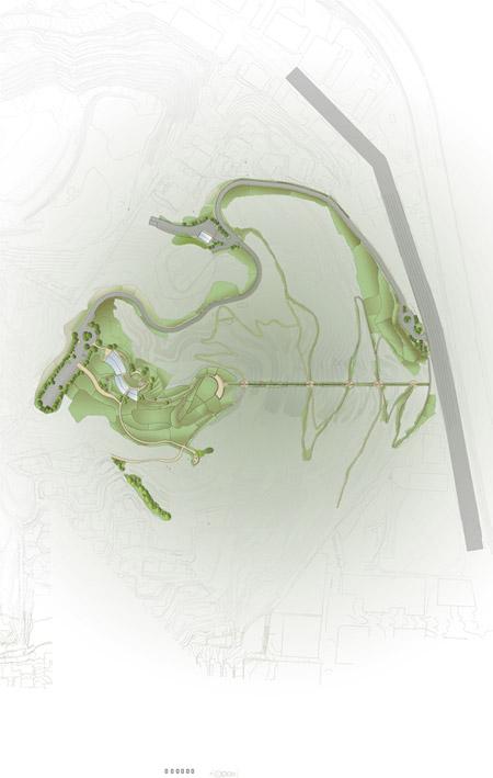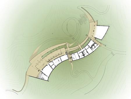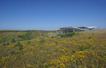 The Visitor center is tucked unobtrusively into a hollow near the summit of the park, its curving forms emulating the sculptural landforms of the site. Large polished concrete walls retain the hillside while floor to ceiling windows open the visitor center towards the landscape and expansive views of the city beyond. The center is comprised of three buildings; the first houses the exhibit space, a small theater, and meeting rooms; the second contains support spaces, bathrooms and a catering kitchen, and the third is an outdoor pavilion for special events that spills out onto an outdoor amphitheater formed from recycled concrete surrounded by landscape exhibits of native plants.