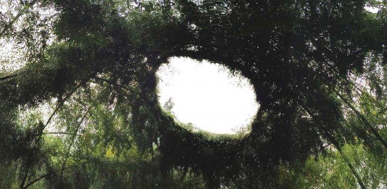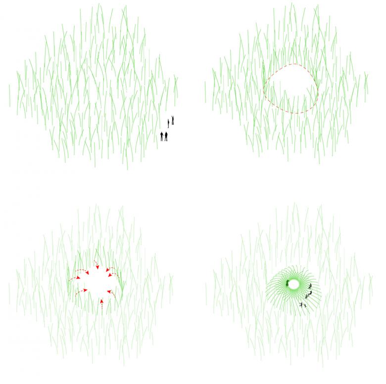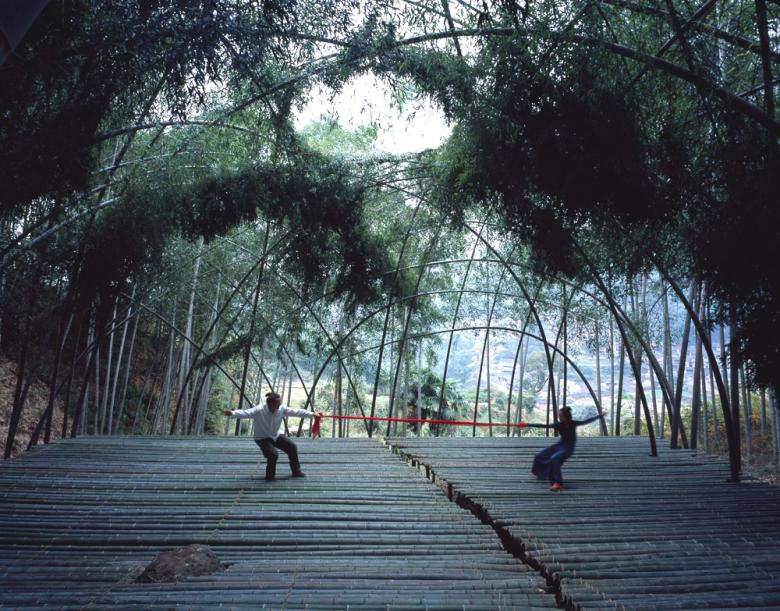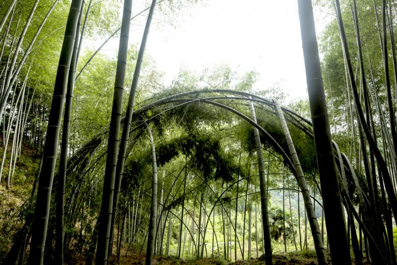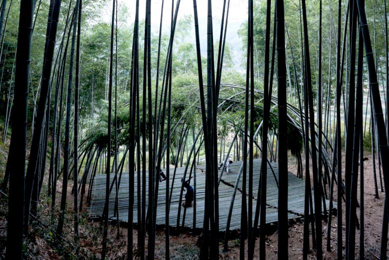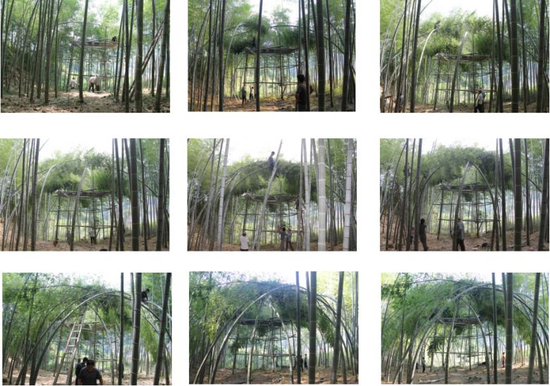 In the case of the bamboo theatre in Hengkeng Village, Xu Tiantian instructed the local villagers in the pattern for bending and weaving the bamboo into the vaulted space with circular opening at the top. This low-tech bio-design approach, makes use of bamboos rapid growth and its bending quality. Furthermore, the growing dome needs little regular cultivation: just once a year, must the villagers weave younger bamboo shoots into the existing frame and remove some old poles. This low-maintenance living architecture provides an extraordinary outdoor space for village activities. Together with the complementary, irregularly shaped, floating Bamboo platform in the centre, the bamboo theatre caters for activities from group performances to individual meditation in a natural space.