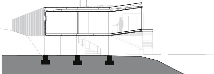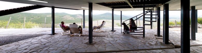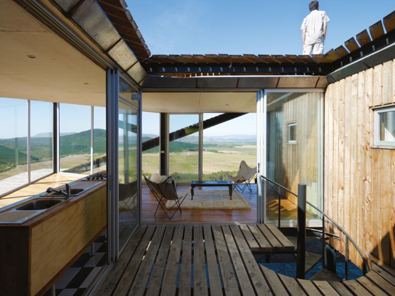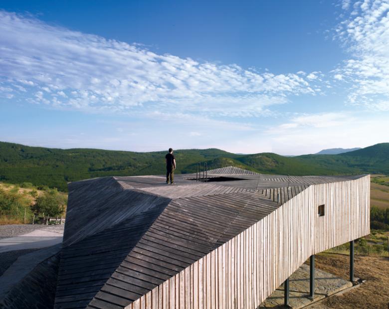 The main façade is the roof, designed as a terrace with a 360º view upon the valley; a structural complement underneath the deck that overtakes the horizontal forces in case of earthquakes. This wooden ‘envelop’ is extended and returned to block excessive sun exposure in the hot summer, but allowing the sun enter in the winter.