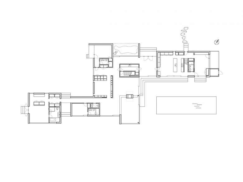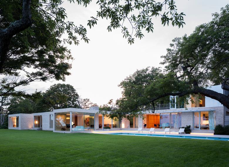 This weekend home, built on the south shore of Long Island, is envisioned as a social platform for the owner, his family and many friends and guests who come to visit and enjoy themselves outside of New York City.  The entry, living, dining and kitchen are the central core where the social activity mixes.  Large sliding glass doors open these areas out to the exterior, allowing people to flow easily between inside and outside. The pool, waterfront and various landscapes and courtyards around the house provide multiple settings for various activities. People can meander as the daylight shifts throughout and around the house over the course of the day, feeling the distinct presence and syncopation of morning, afternoon, sunset and evening.