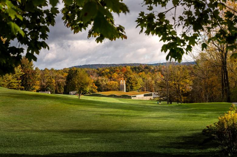 Viewed from the main campus of this independent preparatory school, down a hill and across a golf course, this peculiar looking building with its undulating green roof promises something special. Indeed, it houses a bio-mass heat plant that burns sustainably harvested woodchips to heat an entire boarding school (1.2 million square feet in 85 buildings) with over 600 inhabitants.