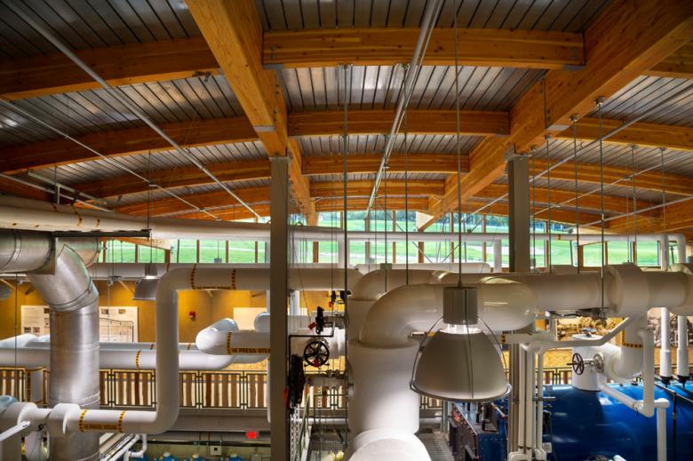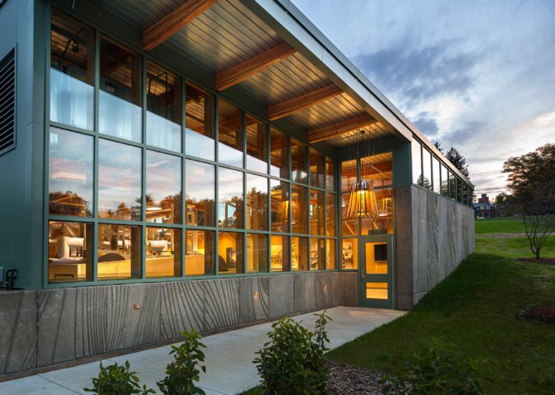 The school wanted this building to be a key component of its commitment to be a carbon neutral campus by 2020. Efficiently burning sustainably harvested woodchips from regional forests has enabled the school to drastically lower its greenhouse gas emissions, including sulfur dioxide and CO2. The LEED certified building embodies many sustainable approaches inside and out, among them the use of renewable wood building materials, such as glulam beams, from responsibly or FSC managed forests. The building’s green roof, connected to nearby bio-swales and retention ponds, absorbs and filters storm water before returning it to the ecosystem. By using local fuel, rather than foreign oil, the school also is contributing to a sustainable local economy. In terms of aesthetics the low, green and undulating profile of the building reflects the surrounding landscape in the foothills of the Berkshires.