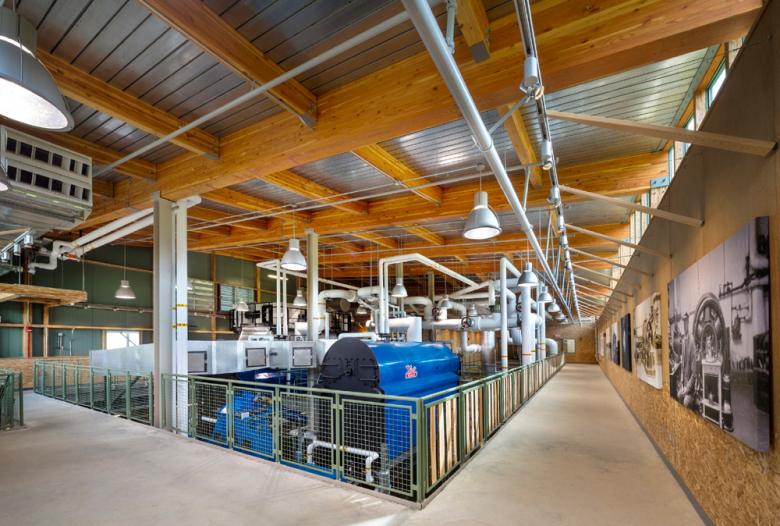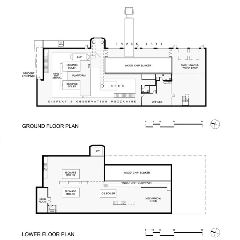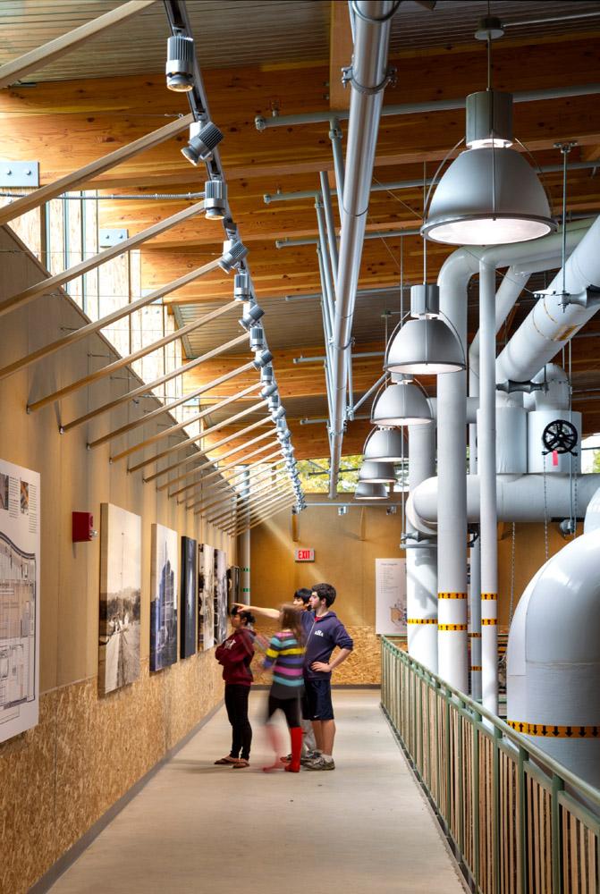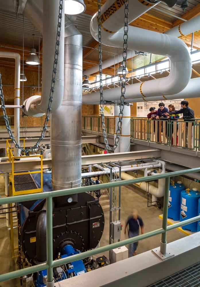Designed as a living classroom, the heat plant exposes students and visitors to ecologically sustainable technologies and materials. The mezzanine walkway overlooks and circumnavigates the wood burning boilers, wood chip bunker and conveyers, the stoker auger, the electrostatic precipitator, the ash auger, and an exhibit with computer terminals that explain the plant’s operation and track performance data.