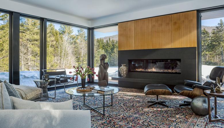 Inspired by the ubiquitous board and batten siding prevalent in the region, this house in Vermont looks like a contemporary rendition of vernacular buildings. Dark and mirrored panels alternate with slender windows to create a rhythm broken up by expanses of glass that take advantage of the beautiful site. Birdseye, which designed and built the house, answered a few questions about the project.
