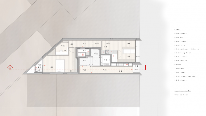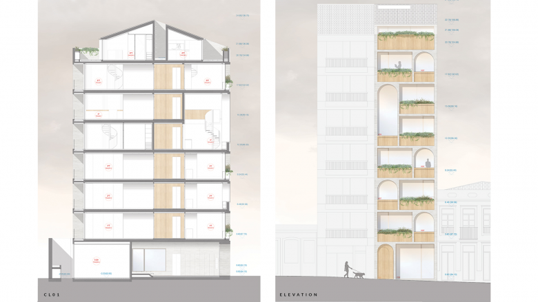 The client’s intention was to create a residential building with studio and one-bedroom apartments. With only 88 m2, a frontage of 5.5 m facing the street, and 2 m wide on the rear elevation, the plot is characterized by its small size and peculiar configuration.