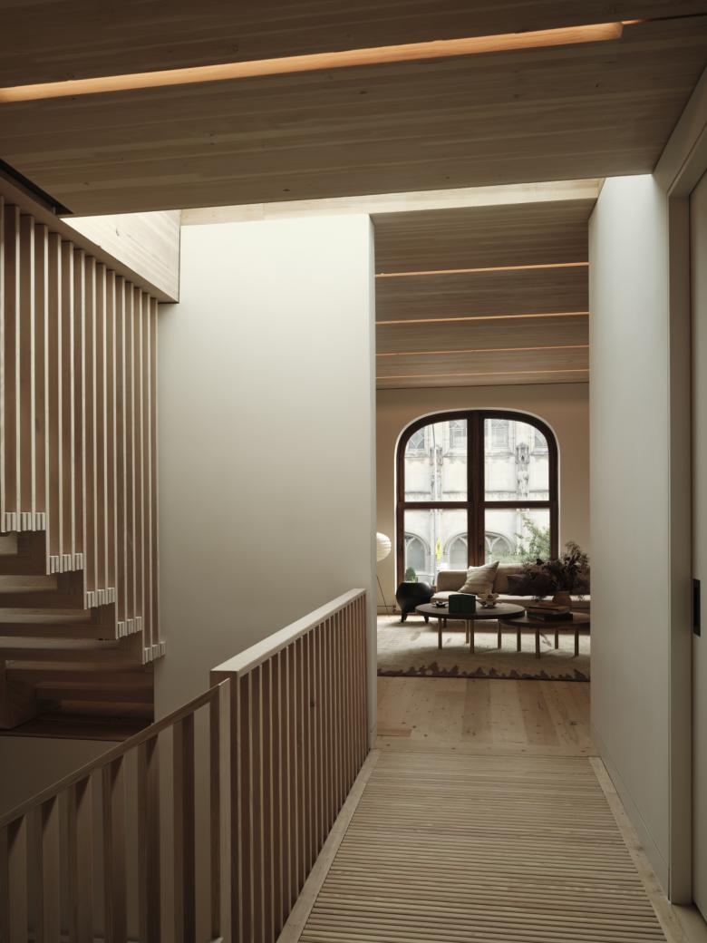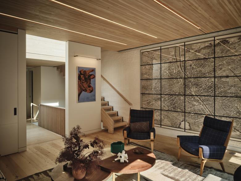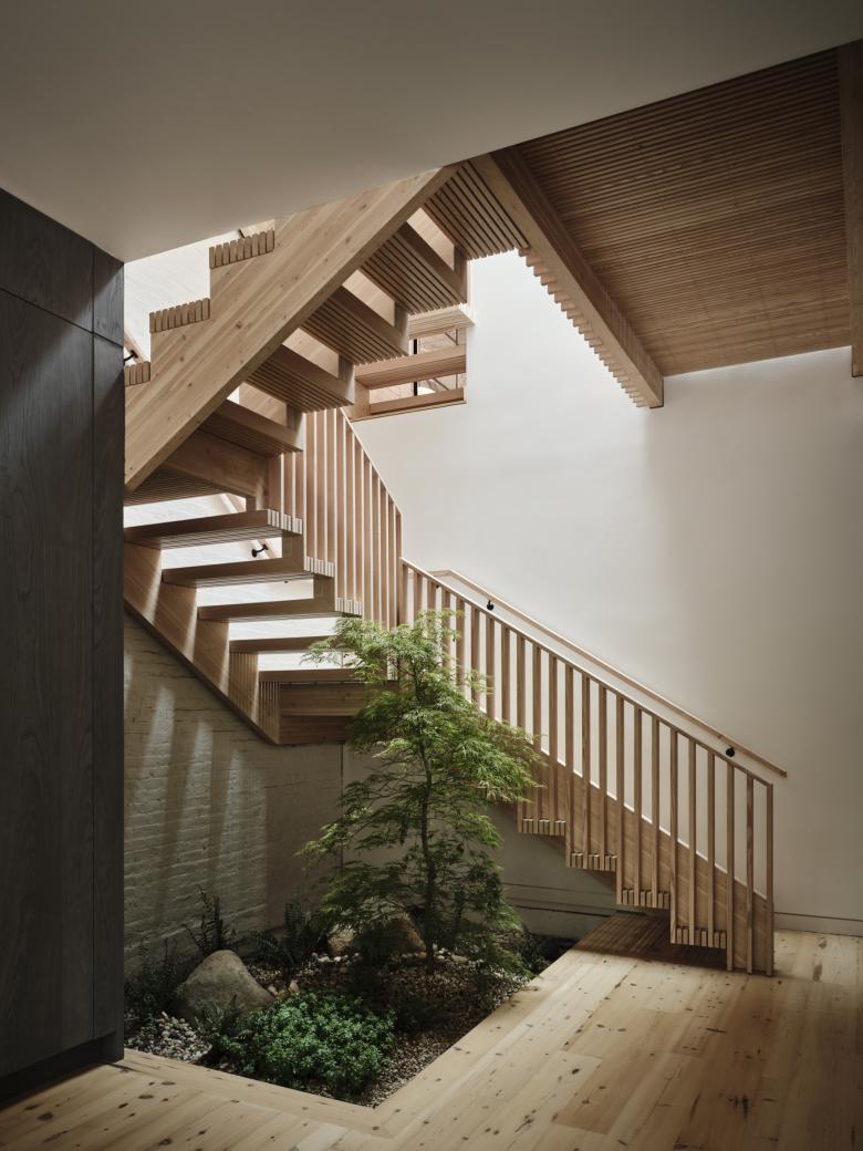 All of this happened within a 3.7-mile radius, further reducing the carbon footprint of the project. A three-story Douglas Fir glue-laminated stair and second-floor bridge carve through the center of the house, tying in seamlessly with the recycled wood floors and mass timber ceilings. The slat stair treads allow a new skylight to filter light all the way to the ground floor, where an old coal ash pit has been repurposed as a planter well to stimulate the production of clean air within the building. The majority of the dowels and screws hidden withing the slatted members are all wood. The only metal screws and bolts are installed beneath concealed wooden covers that slip off. The whole system can be tightened,