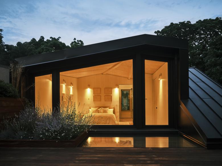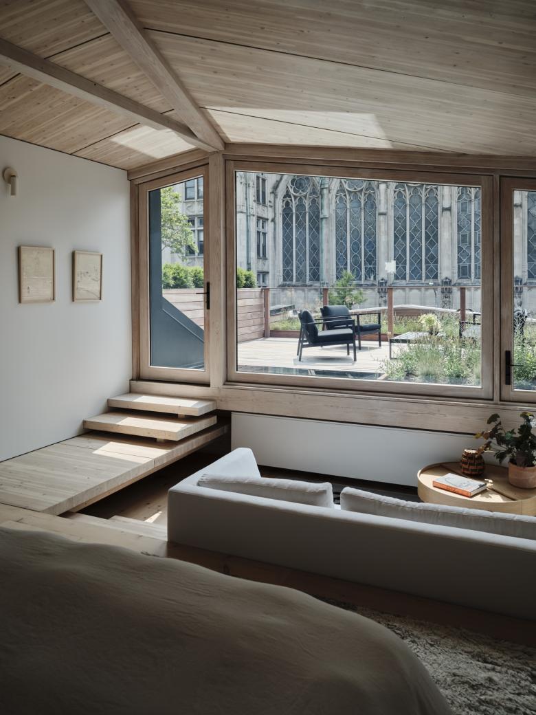 To take full advantage of the home’s location, the newly added primary suite on the top floor features picture windows and a terrace with stunning views of one of New York City’s few Gothic Revival style cathedrals. In the face of pandemic shortages, we elected to partner with a local wood-window fabricator and manufactured all the building’s custom windows in wood a few blocks away, in the Brooklyn Navy Yard. This approach reduced costs from large corporate window manufacturers and allowed us to detail the windows specifically for this project (in solid timber) in unique ways including the fifteen-foot-wide pyramidal end to end wall of glass on the third floor roof deck.