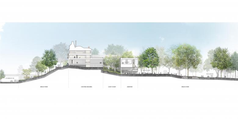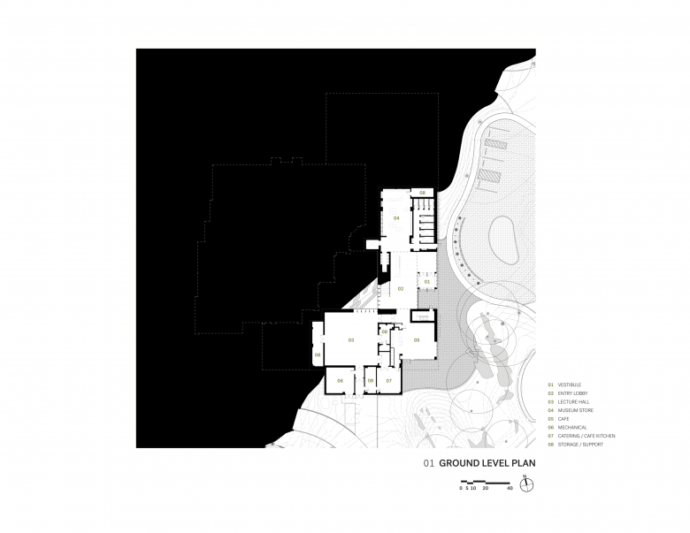 The initial planning strategy of maintaining all public gallery spaces on the same level resulted in the new gallery program extending out over the sloping hillside below. New public lobby, café, gift shop and lecture hall spaces are located beneath these galleries to backfill program into the sloping site. This planning strategy results in a new front door to the museum that is highly visible and immediately accessible from the level of the adjacent Bruce Park.