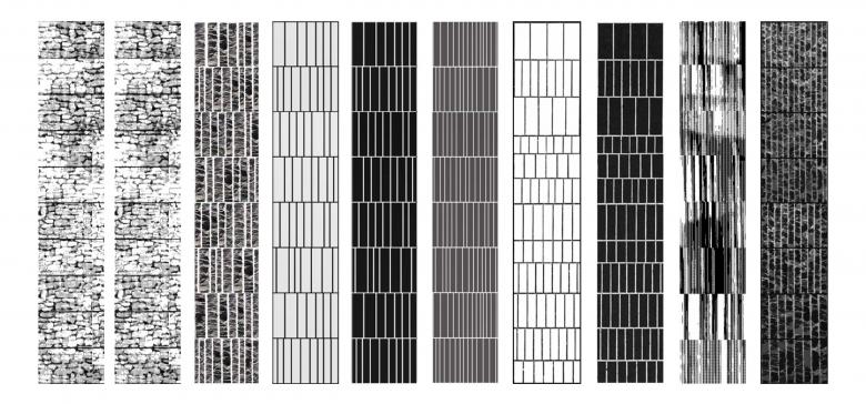 Stone quarries are found throughout the region, where the act of carving into the earth produces a series of striated layers of cut material. The streaking of dirt and soot further articulates the face of the quarry and produces a wall of graphic contrast.