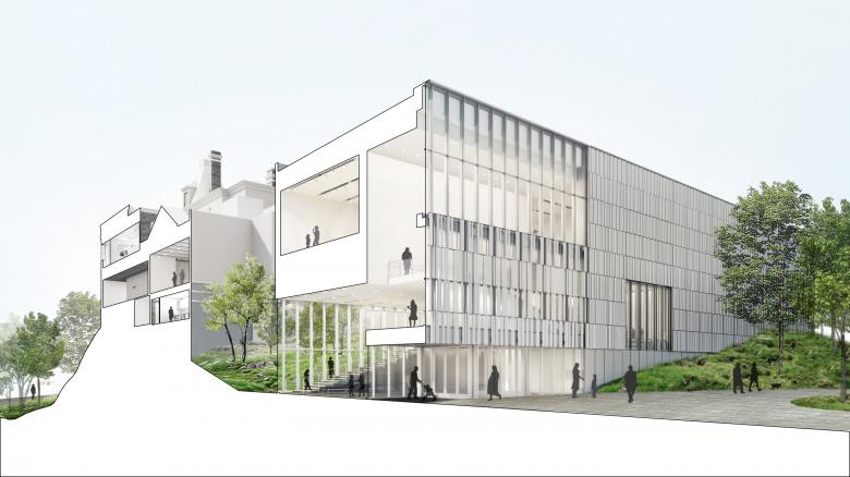 The design of the 42,000-sf expansion addresses the shortcomings of the previous arrival experience. A critical design decision was made to locate all the expanded gallery program at the same level as the existing museum galleries. This results in the expansion extending out over the hillside, providing an opportunity to infill the space below while carving into the hillside as the massing steps down to the park below.