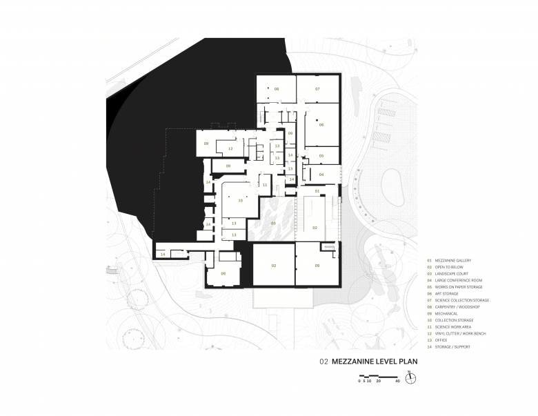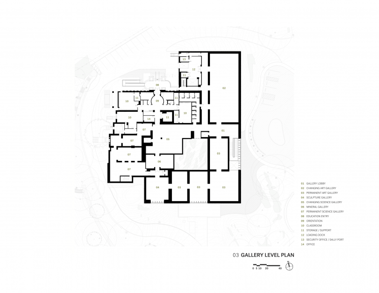 The planning organization of the gallery expansion forms a U-shaped footprint that connects to the existing building at two locations, wrapping around the hillside that abuts the museum. Between these two points the design team created a captured courtyard, drawing the space of the park into the museum itself.