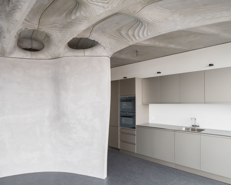 The ground floor of DFAB HOUSE is designed to be a shared space. Characterized by floor to ceiling windows supported by 15 bespoke, curved concrete mullions, the centerpiece of the room is the Mesh Mould wall, an S-shaped structure providing natural shared and hidden spaces to the house’s inhabitants. The non-standard, curvilinear wall provides load-bearing support for the undulating Smart Slab, a geometrically complex structure, forming the ceiling. Traveling up to the second and third floors of DFAB HOUSE, visitors are transported from the clean yet organic lines of the ground floor to the feel of a contemporary Alpine chalet on the residential second and third floors. Split into four standalone apartments, robot-built Spatial Timber Assemblies provide a warm, homely feel and catch the eye with their non-uniform placement, while the lightweight translucent facade made with Aerogel ensures that natural daylight penetrates the outward facing walls, while also providing inhabitants with privacy and thermal comfort.