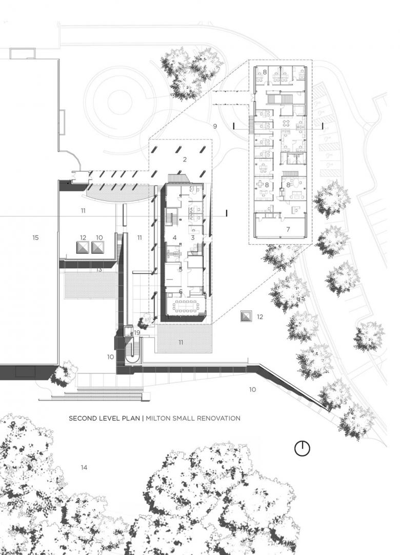There were three ideas central to the development of the building’s composition and fabric. First, the new addition was designed to interconnect a series of existing buildings on the CBC headquarters campus, drawing together staff members and enhancing informal interaction between the company’s various departments. Second, the working spaces within both the building addition and renovation were designed to introduce an open office concept for the company, intending to get staff members out of their “silos” and into a series of collaborative environments that CBC believes to be a more productive work place context. Finally, as previously noted, it was critical that the new addition be a gentle mediation of the existing campus buildings and their surrounding gardens. Accordingly, the addition’s low-slung profile, tucked tight against the original Milton Small Building, preserves both views and access out to the garden as well as minimizing the addition’s physical impact on the site.