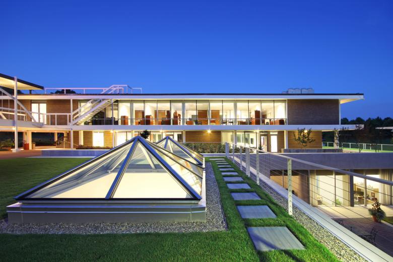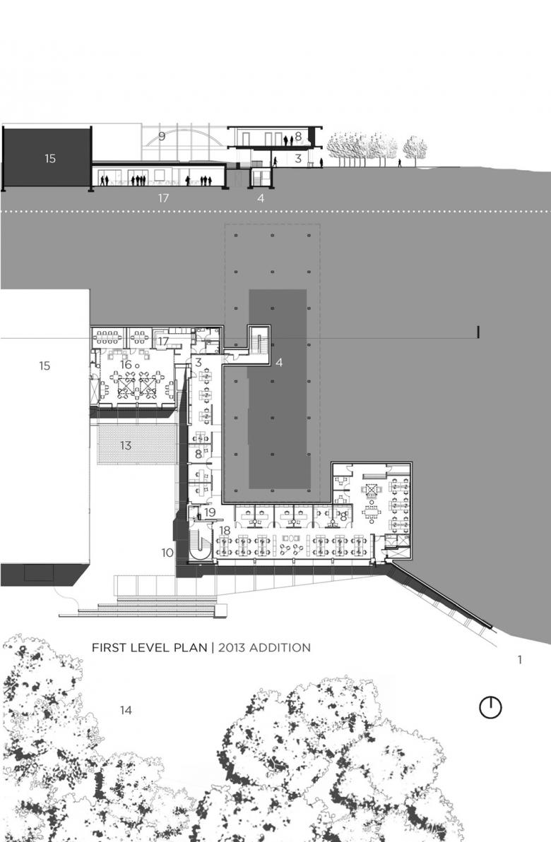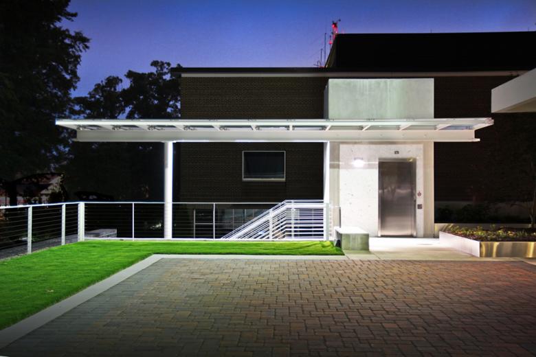 To preserve WRAL Gardens and the significant open space amenity it offers area residents, the new addition was positioned tight against the original Milton Small Building at the elevation of its underlying foundations. The addition is therefore partially underground, a design strategy that minimizes its visual and physical impact on the Small Building and adjoining gardens, and preserves views to the garden from the campus's public interior and exterior spaces. The below grade position of the new addition and its covering with a landscaped "green" roof also minimizes the addition's heating and cooling loads, resulting in appreciable energy savings.