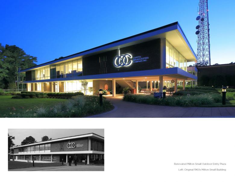 This multi-phase, $3 million project begun in 2011 consists of a series of additions and renovations to the Raleigh campus of the Capitol Broadcasting Company that houses their corporate headquarters, sales and marketing division and broadcast studios for WRAL and Fox 50 Television. In addition to providing an additional 8,000 square feet of new space and 6,000 square feet of renovated space, key considerations were the preservation of the WRAL Gardens, located south of the campus and the restoration of the company's original corporate headquarters, a historically significant mid-Modernist building designed by Raleigh architect Milton Small (known informally as the "Milton Small Building").