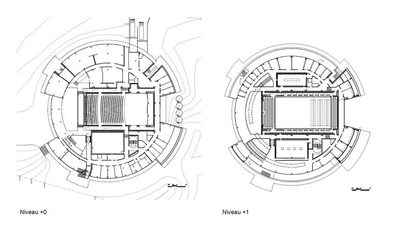 The aim of the distribution of activities is clarity and legibility. On arrival, the visitor encounters the main concert or performance hall, the conference rooms, and the black-box theater. To the left are ground-floor educational spaces. To the right is access to the learning center and the restaurant, which also has an independent entrance located near its terrace. A series of side openings articulates the periphery. A forecourt to the main entrance and the concert hall is located along the west facade.