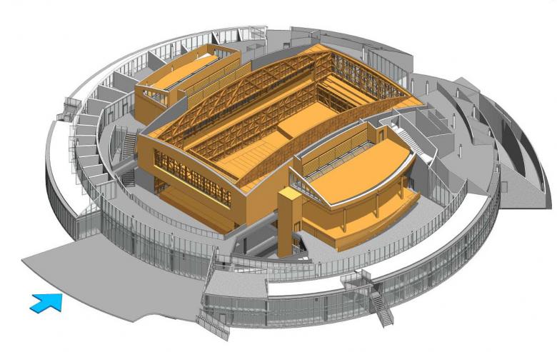 The architectural concept articulates the building into three parts: first, the dome with its steel structure and stainless-steel outer envelope; second, the base with two carefully detailed concrete levels accommodating art studios, practice rooms, learning center, backstage, and all offices; and third, the wooden core containing the concert hall, black-box theater, music rehearsal room, and library.