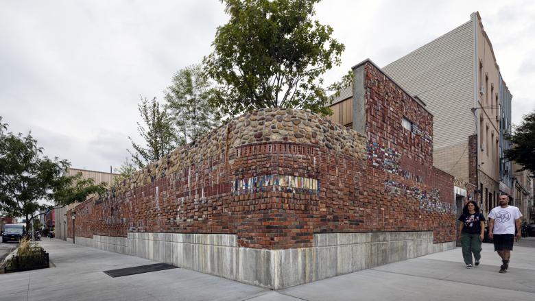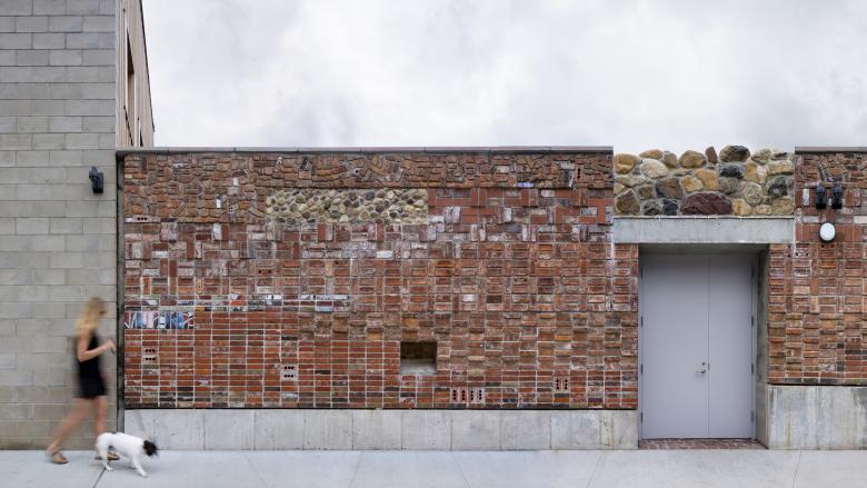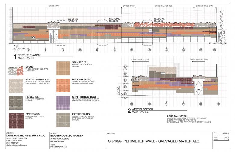 It began as an adaptive reuse project. When we realized the existing warehouse buildings weren’t structurally sound, we decided to reuse the building materials from the site and create new architecture from the “palette” of historical materials: masonry, wood, glass. The resulting garden and series of buildings are interwoven into the new design. The exterior wall is 200 feet long and 12 feet high, made entirely from materials repurposed from the site. We collected, sorted, stored, cleaned and refashioned the facade as a historical record of the buildings that came before our current development. This is also a reaction to the street art in the area. The wall functions as a “teaching” art piece in a neighborhood filled with street art.