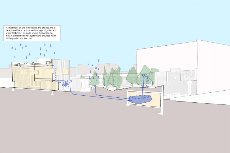 Existing site materials, many from the 19th century (and rocks that are 500 million years old), were repurposed. A new rainwater tank and circulation system was implemented to collect, store, filter and recirculate all site stormwater for reuse as irrigation and to supply water features. The windows are automatically controlled by a system that senses indoor and outdoor temperature, humidity, CO2 levels and weather to automatically open and close the windows as needed to optimize comfort and CO2 in the conditioned spaces. It is the first system of it’s kind used in NYC and one of a handful of places it has been used in the US to date.