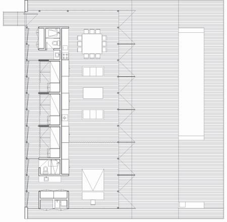 The wooden sheet of the deck runs the entire length of the house, from the lowest part -into which the swimming pool is incorporated- to the roof, showing the use of wood at every point. The principal deck follows the inclination of the lot to create a monumental chaise longue the size of the house. The roof slants in the other direction, serving as a solarium looking westward.