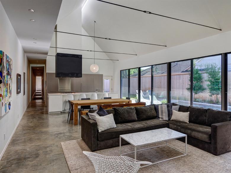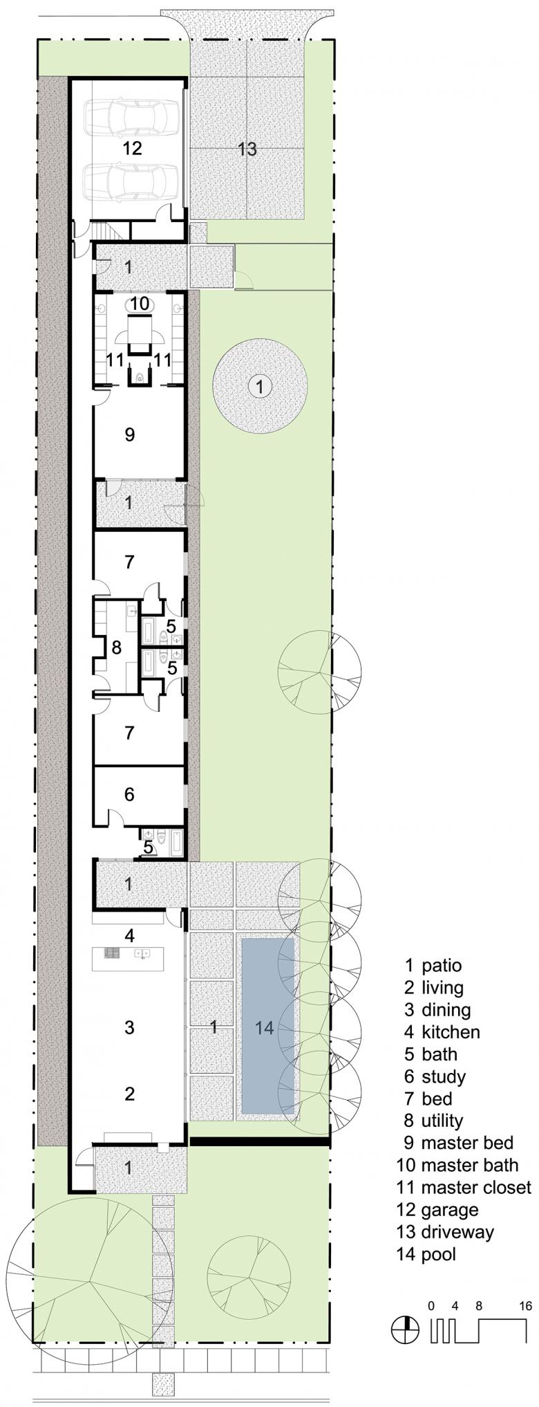 The site is long and narrow, measuring 50’ x 220’, and is located in a part of East Dallas that is transitioning from starter homes from the 1950s to McMansions. What makes this site interesting is that it is oriented on a true north-south axis. The ideal passive energy orientation for the building would be linear in the east-west direction, so the site has some solar orientation challenges to overcome. Sadly, most new construction in the neighborhood ignores solar orientation altogether by simply dropping a big box on the site and pushing it up as close to the street as possible. Instead, we decided to explore creating a simple shape and extruding it the entire length of the site, creating a large outdoor space in the process.