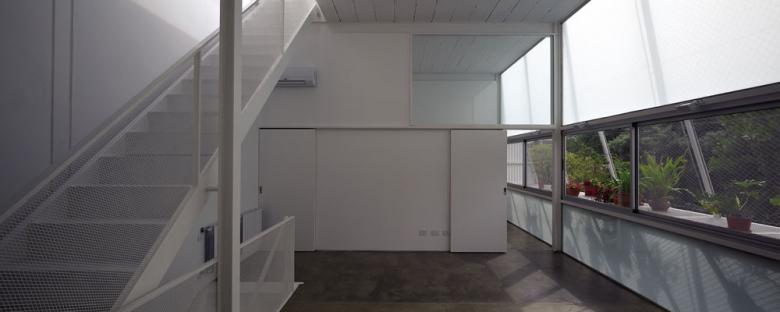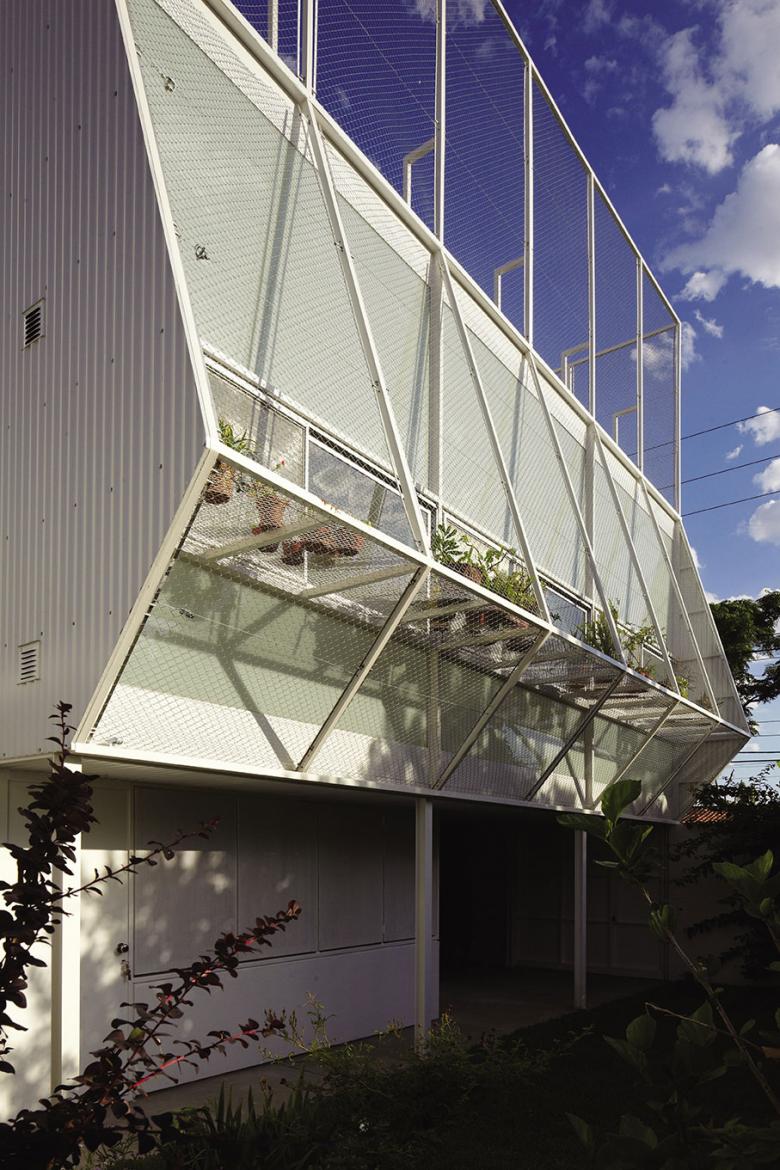 Metal decking extends all along the framework, becoming the support for new vegetation that, seen from within, seems to merge with the garden next door.