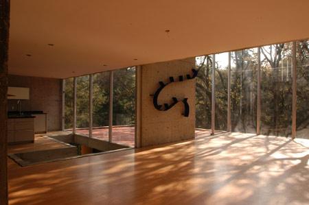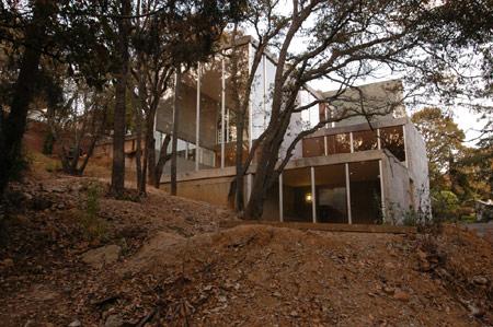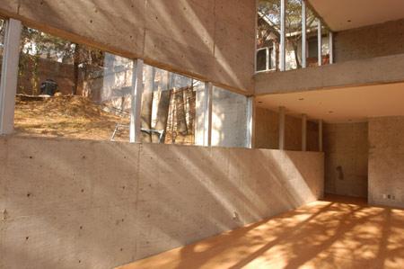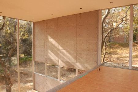 The structure is a system of 4-inch rectangular profile tubes every 1.5 meters, which also serves for the fenestration. The windows are modular pieces that can be inserted where needed. The rest of the house is of exposed concrete, the pattern of the formwork repeating the modulations of the structure. These elements allow the woods into the house and terraces, as the floor slabs disappear and the object becomes one more element in the landscape.