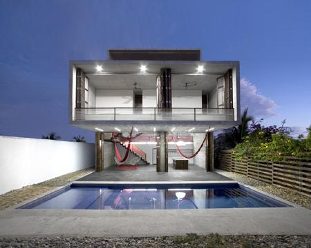 The great constructed exterior, forming a threshold under the imposing cantilever, is the most important space of the house, its central focus. It has all the characteristics and potential of a made-to-measure interior: connected with the spacious central core of the house, protected by the balance and rigor of the constructed object, but at the same time supplied with light, water, and air, close to the lush tropical vegetation and colors that contrast with the neutrality of the concrete. All of this, suspended in the hammocks, reinforces the solidity of the structure and the ease with which it is inhabited.