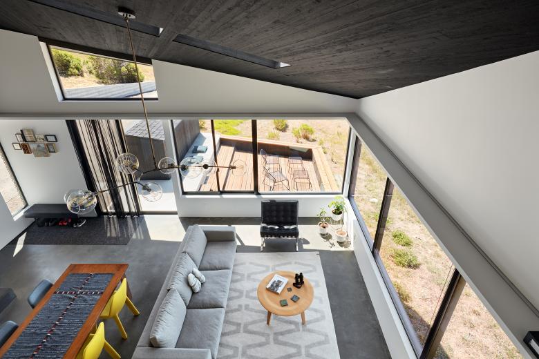 A truly open floor plan includes just two enclosed bathrooms while the rest of the flex spaces are divided by a series of curtain systems and separated floors. The functional kitchen wraps around a central core allowing for unobstructed views of the ocean and forest throughout most of the house.